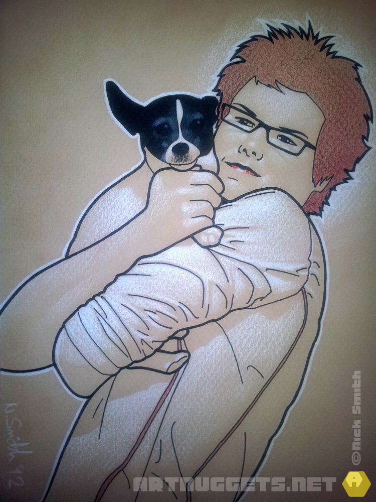 A portrait done as a commission for a friend. It took about four hours using coloured pencil and black PITT pen. The original photograph was a nice composition, which always helps.