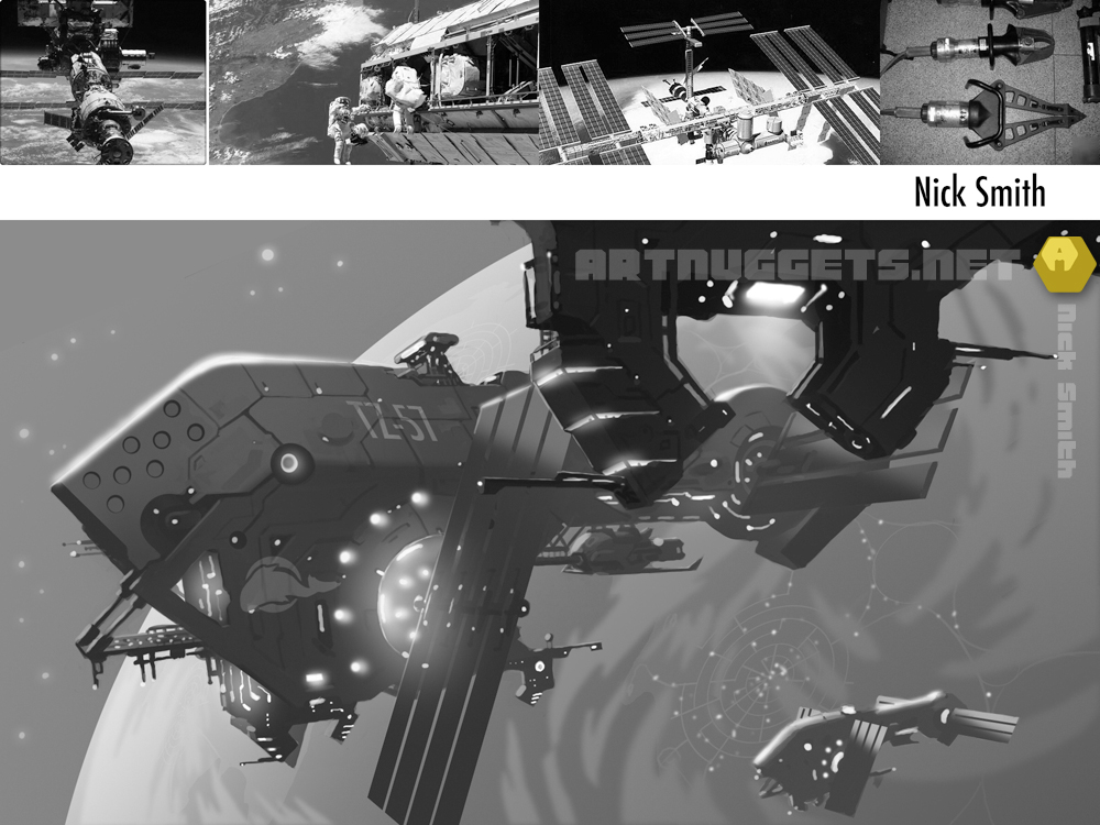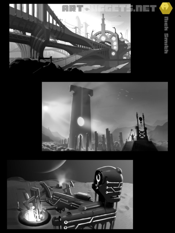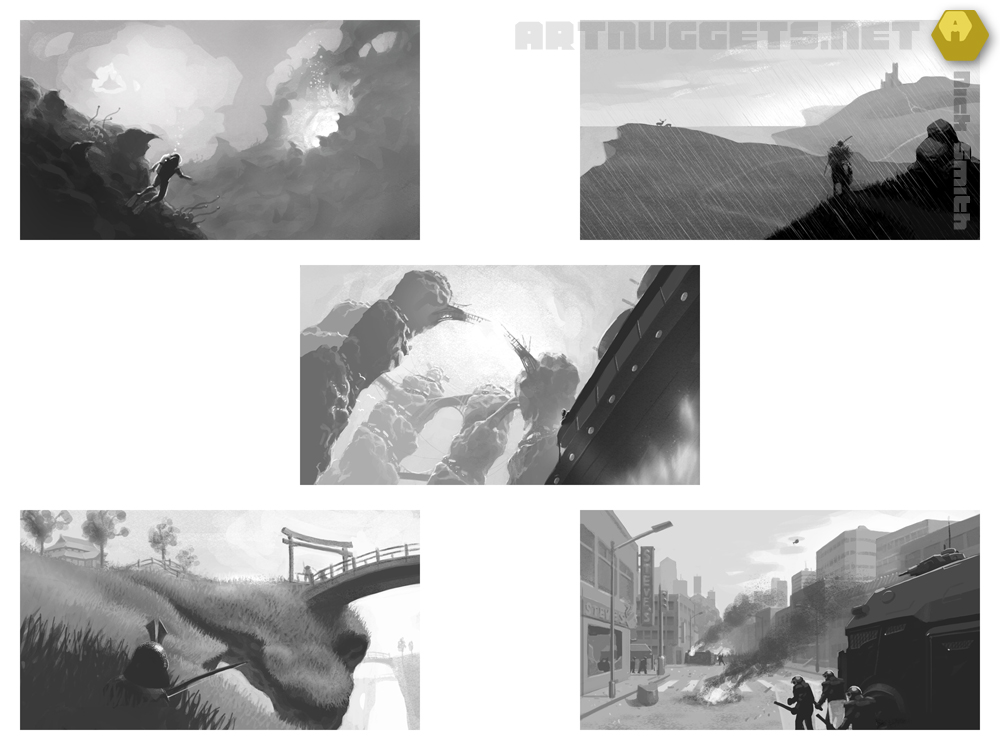 Below are my homework assignments for the first three weeks. Week one concentrated on composition and value, with five images to be roughed out for homework. The focus of week two switched to lighting, with three images asked of us, while week 3 was concerned with bringing the standard up with regard to detail and finish. The brief was for one image that had outer space as its theme, with special concern given to scale.