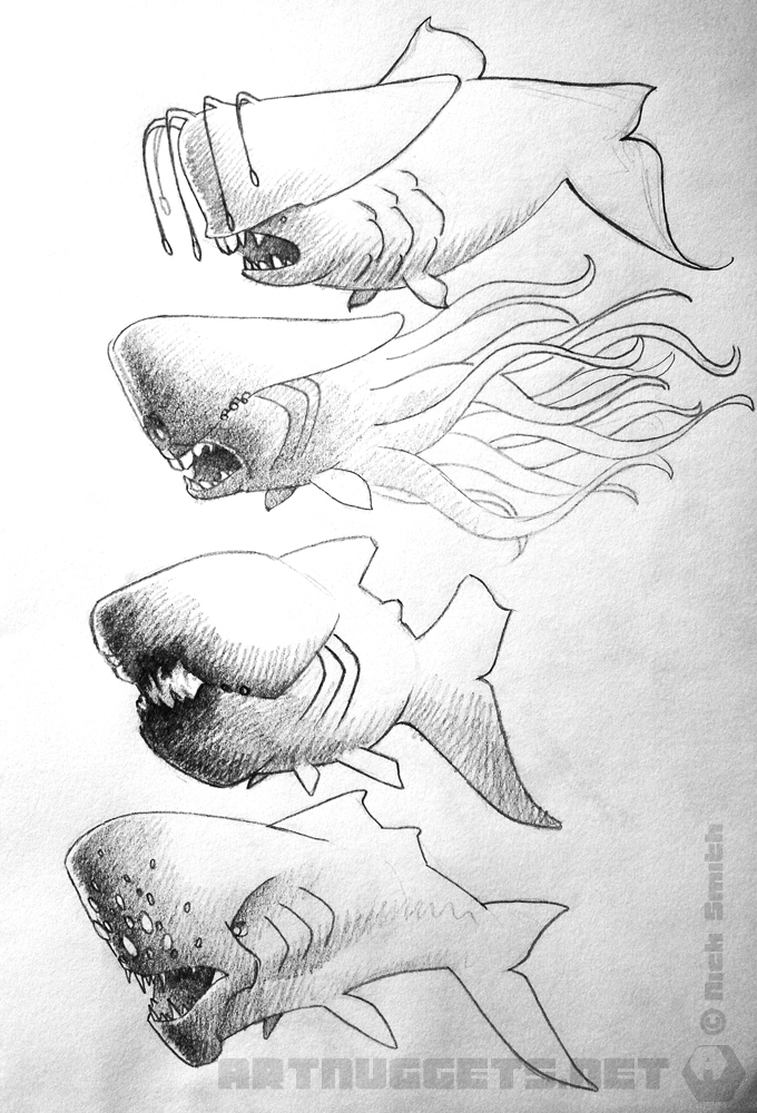 I had fun creating this image. Still working out my comic style for when it comes to creating my own comic HILT. The fish were fun to draw as well and at one point I was considering using all of them together. In the end I settled for an oppressive school of the second design. The deep sea aspect of the comic allows for so much scope for aquatic beasties. Must be very enjoyable.
