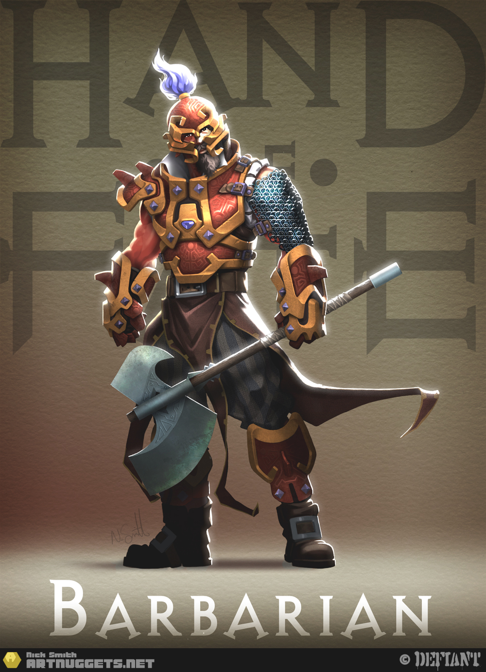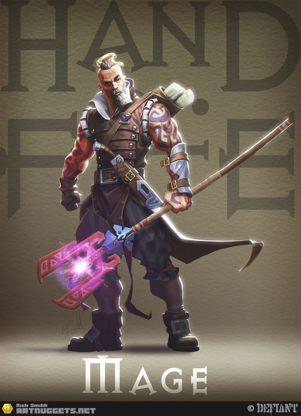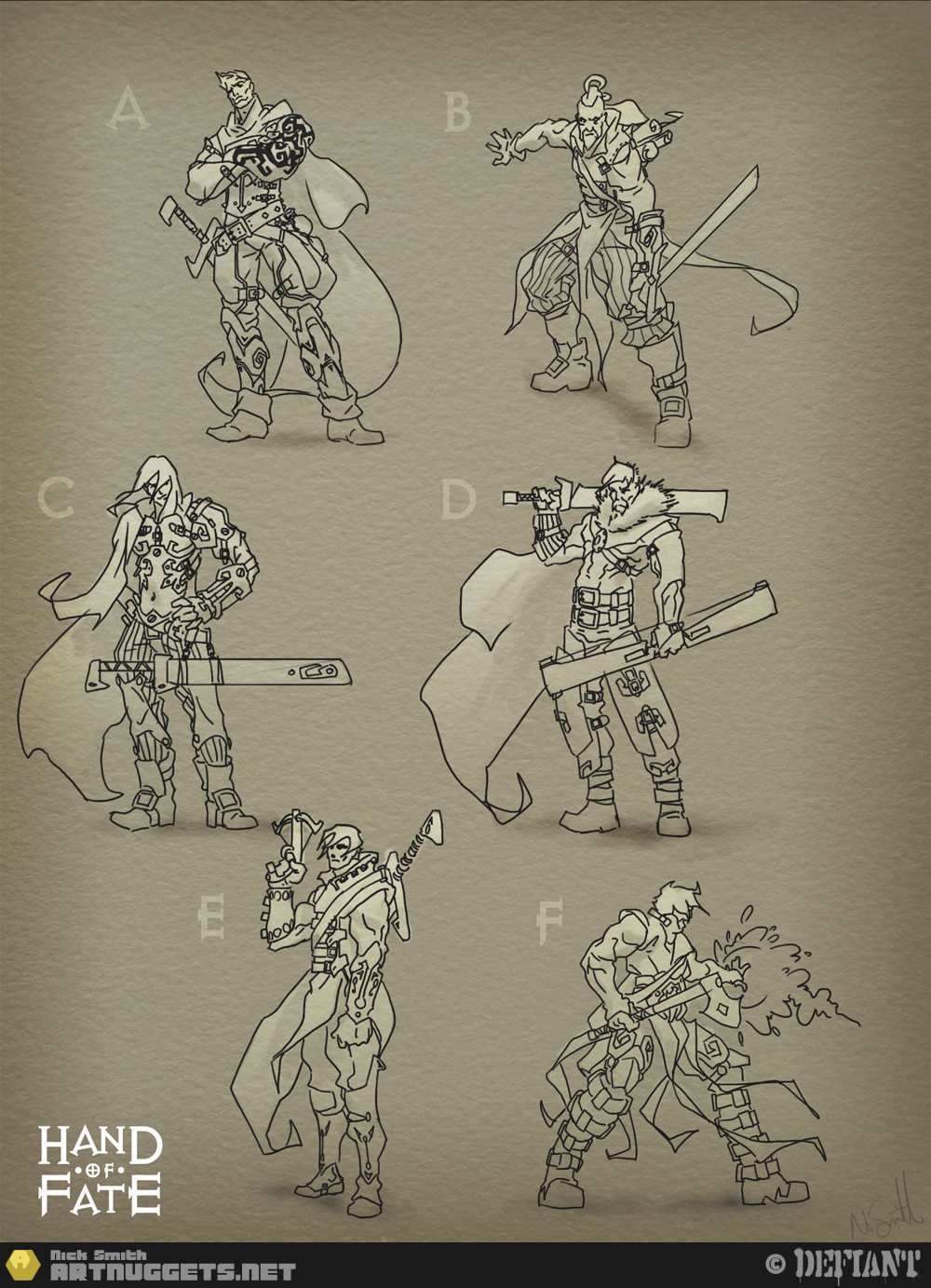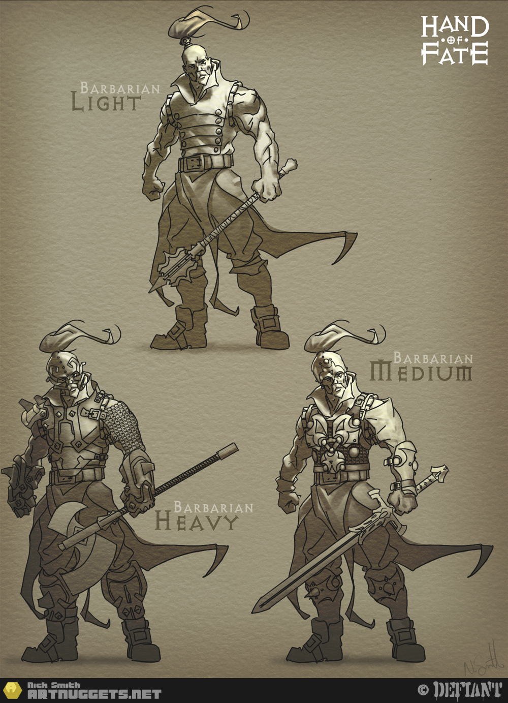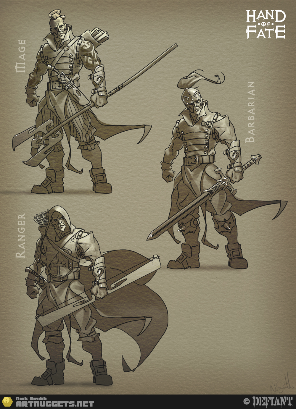 For the last few months I have been working at Defiant Development on their downloadable adventure game Hand of Fate. I’ve had the pleasure of working on the character designs and have really enjoyed it. We started on the player character with the idea that you could choose to be one of three classes, with each class having a light, medium and heavy version. Later I will be posting concepts for the various races featured in the game.