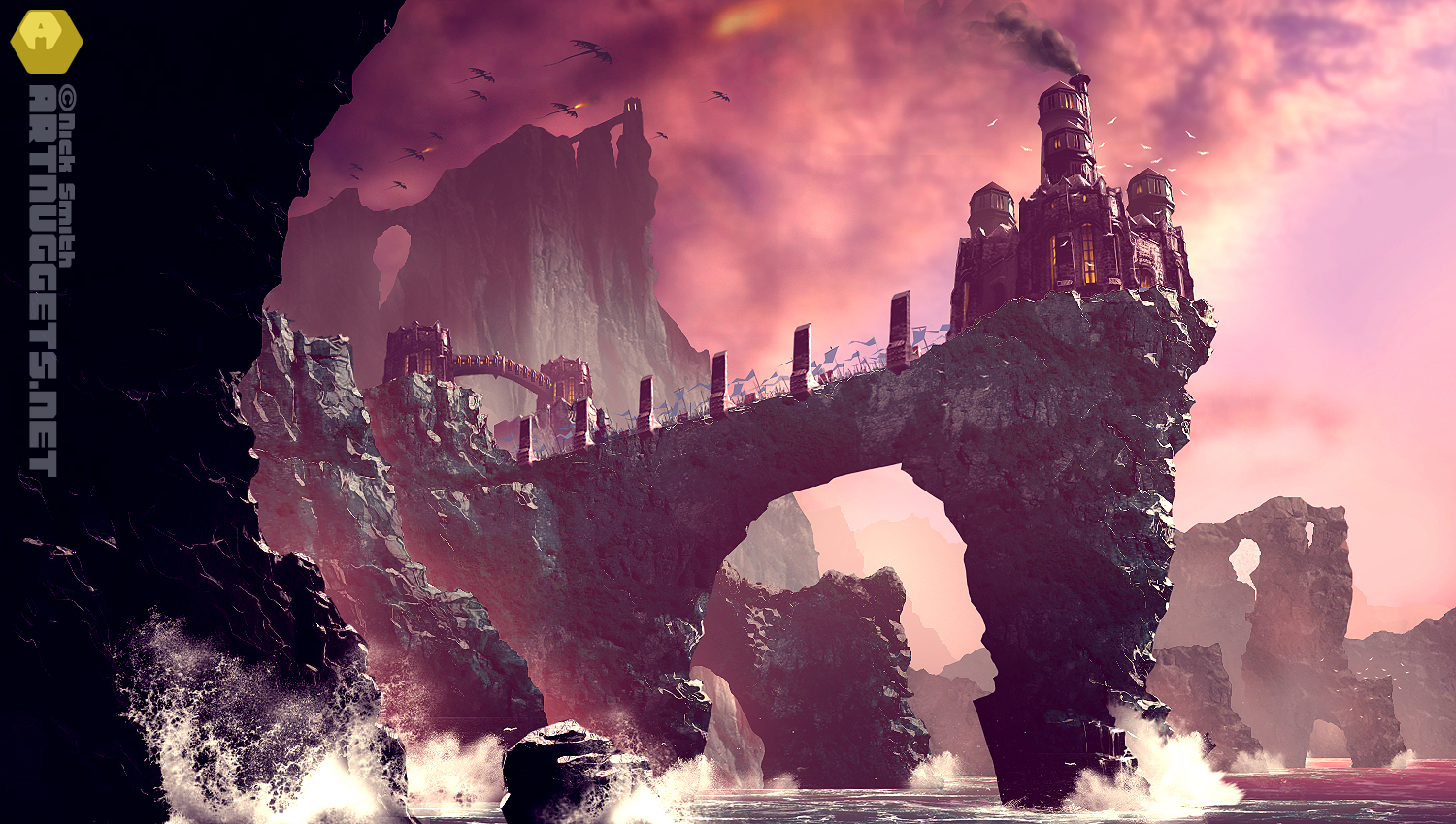 So here are the final pieces. With the top one I added a few more dragons in front of the mountain side so they would look as if they were swarming over it more. I also pushed the castle back a bit by adding a little haze to the upper reaches. The bottom pic went through a more drastic overhaul since the last update. I implemented the advice that was given, sharpened up a lot of areas and included the seagulls which gives the whole piece more depth.